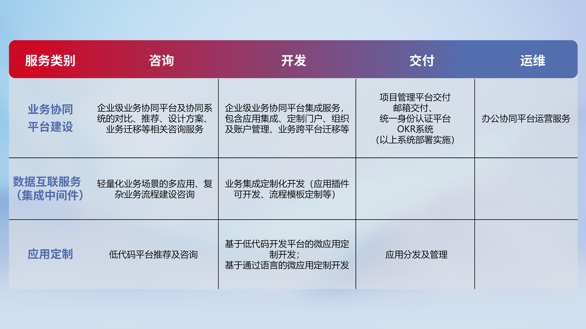 针对钉钉、、、企微、、IDaas等平台级产品提供产品的规划、、、、方案、、、、交付、、、定制化开发等服务,,实现如统一协同办公、、智能客户服务、、、混合会议管理、、智能数据查询、、、、等业务场景,,实现数字化转型。。