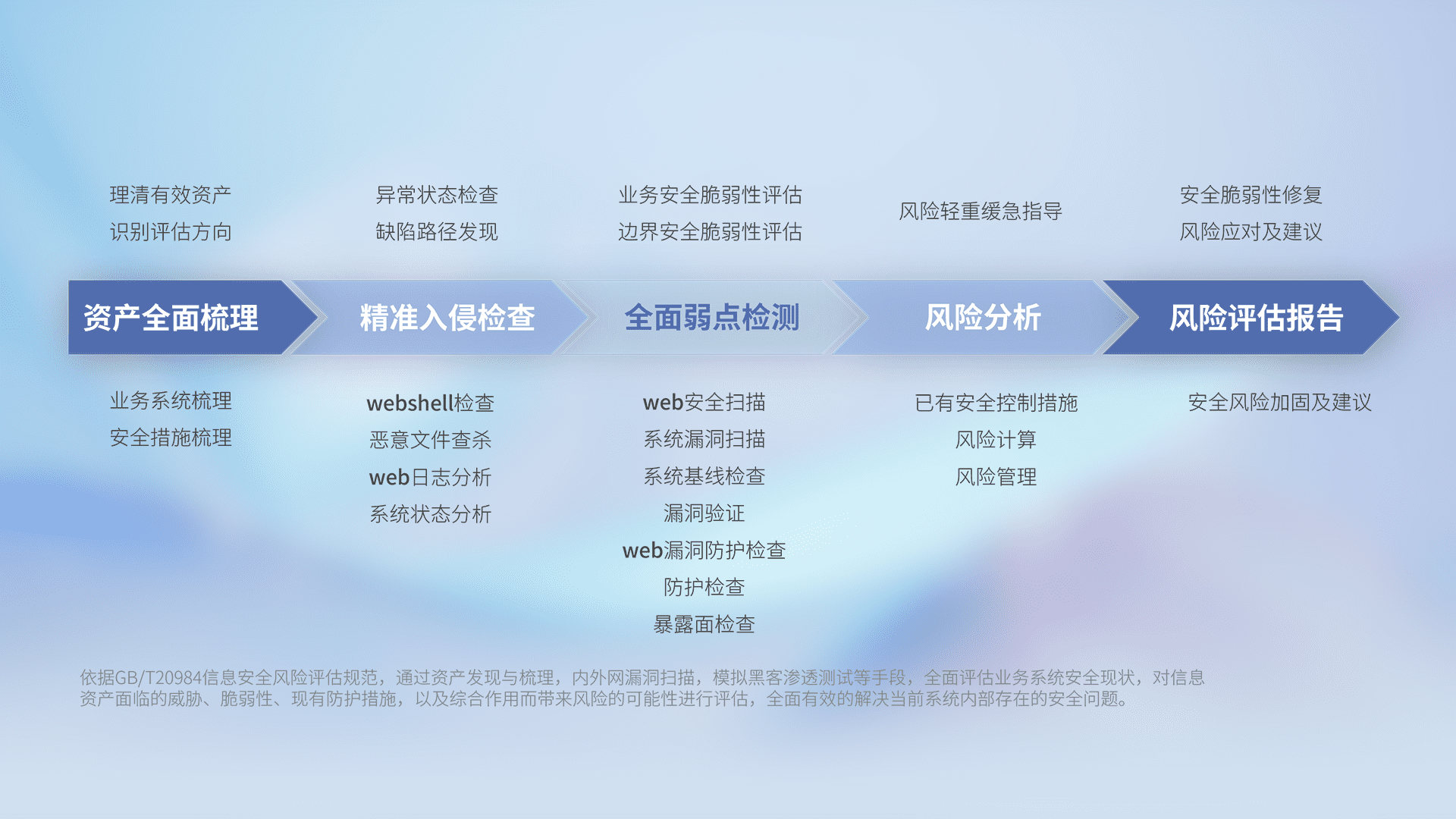 针对客户行业特性,,以专业的安全服务+多厂商联合解决方案提供专属的一站式安全管理服务,,,帮助客户全面感知网络空间威胁,,基于识别、、检测、、、、分析、、、、防护、、、监测、、、响应的服务理论模型,,,从方案咨询、、集成交付、、、评估验证、、、优化加固、、、、运维运营,,致力于为客户提供完整的闭环管理式安全服务。。。。以实战经验为客户打造高抵御风险的安全体系,,帮助客户发现威胁、、、对抗威胁、、处置威胁,,不断积累安全对抗能力,,,持续保障数字化安全。。。